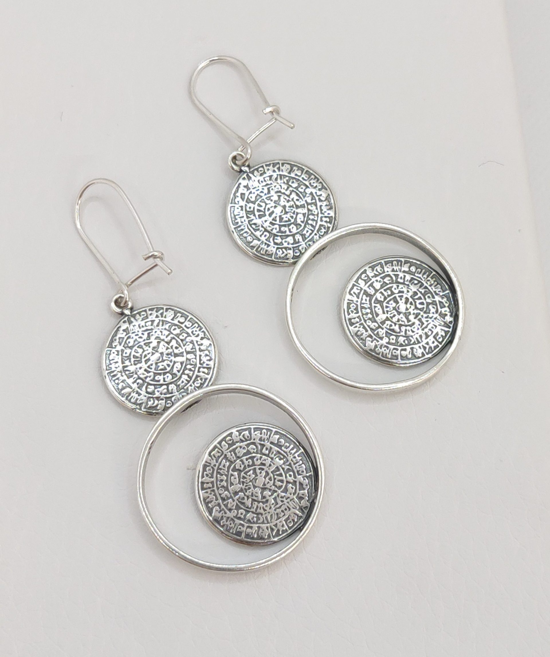 Dangling silver earring with two Festos discs, the one framed by a cycle that accentuates the unique symbol of Minoan culture