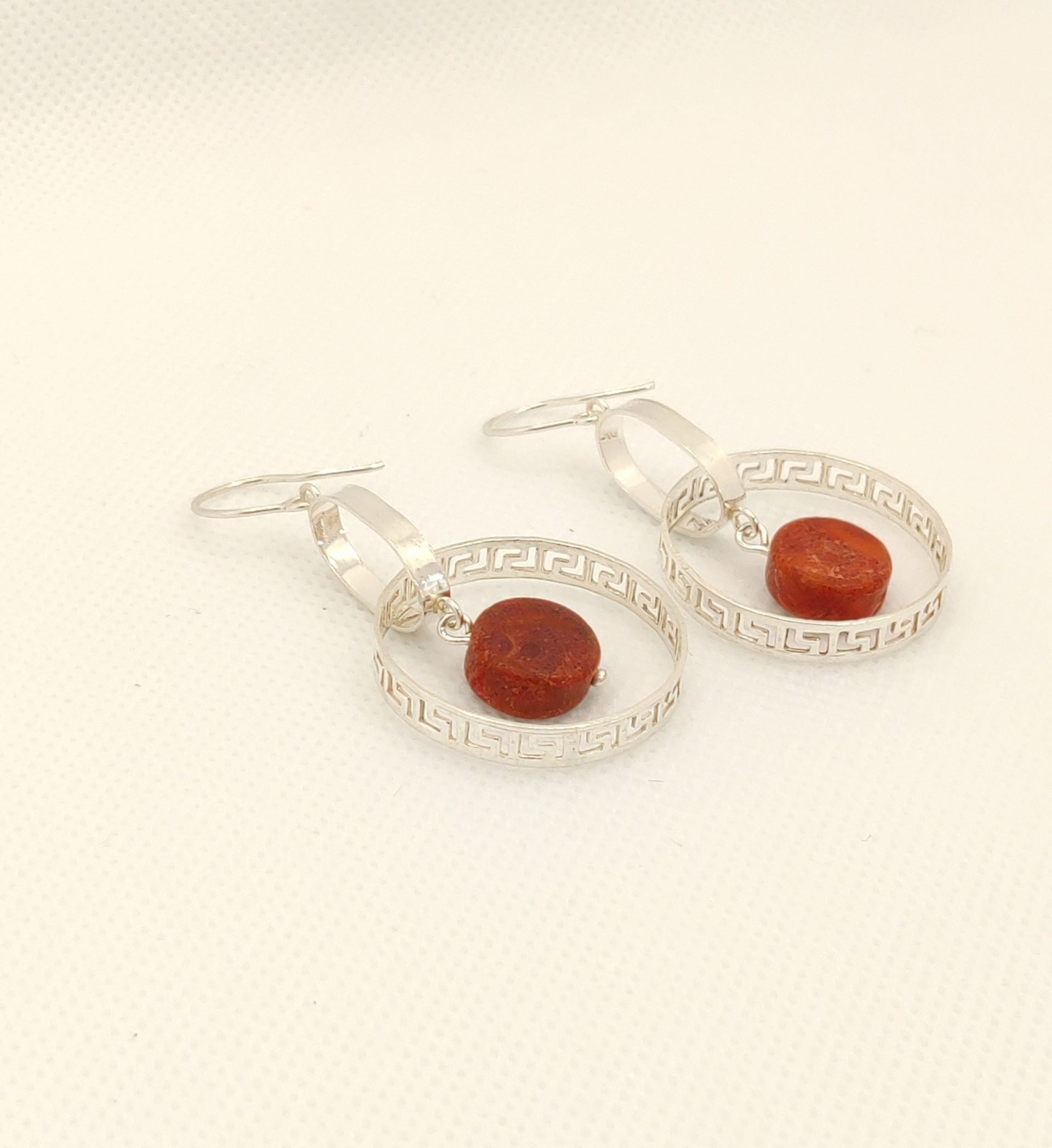 Modern earrings with a coral color stone. Combines contemporary motifs with the eternal meander