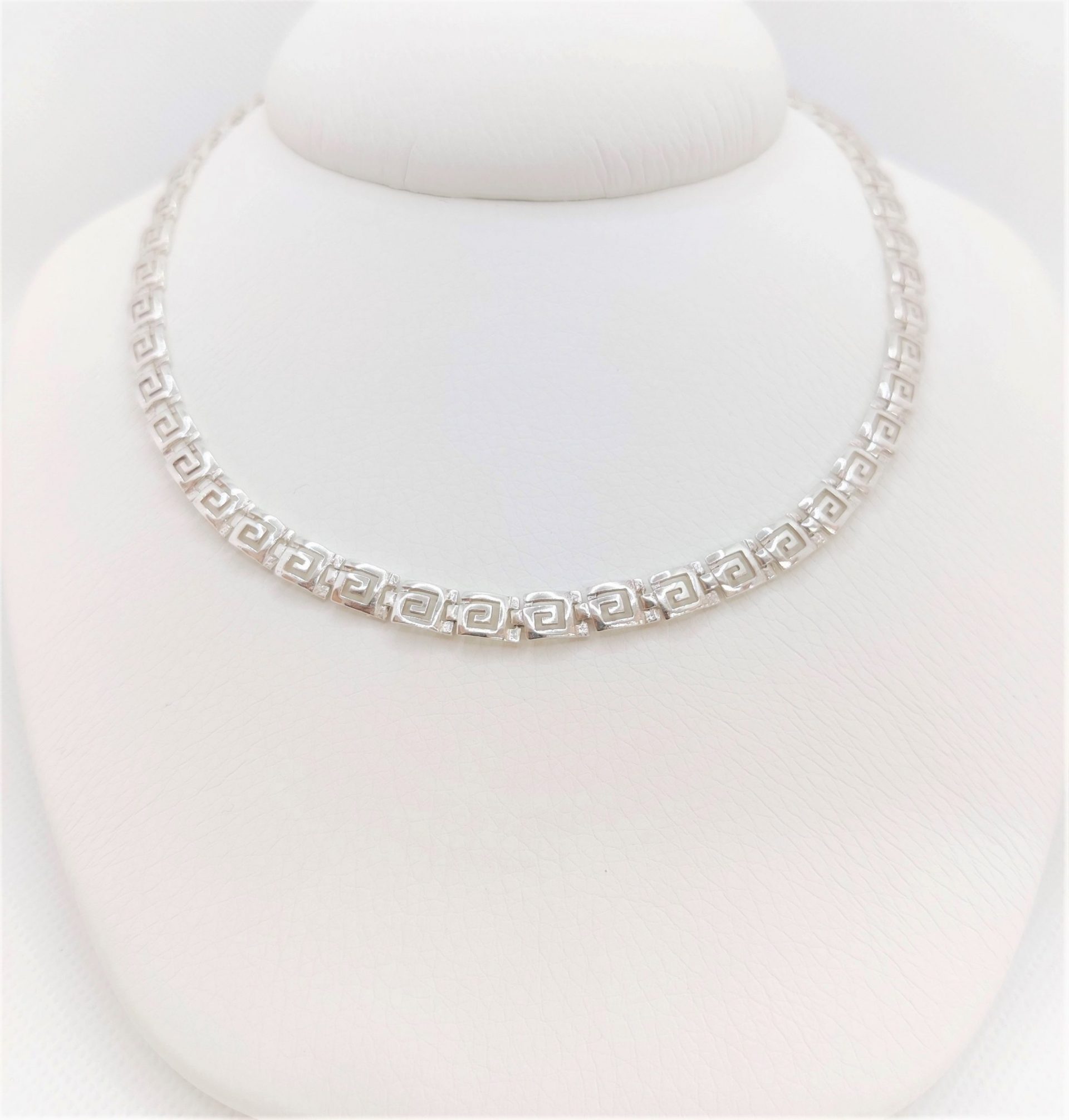 Necklace with square perforated and slightly curved motifs of meander. The absolute greek design transformed in a very feminine jewel
