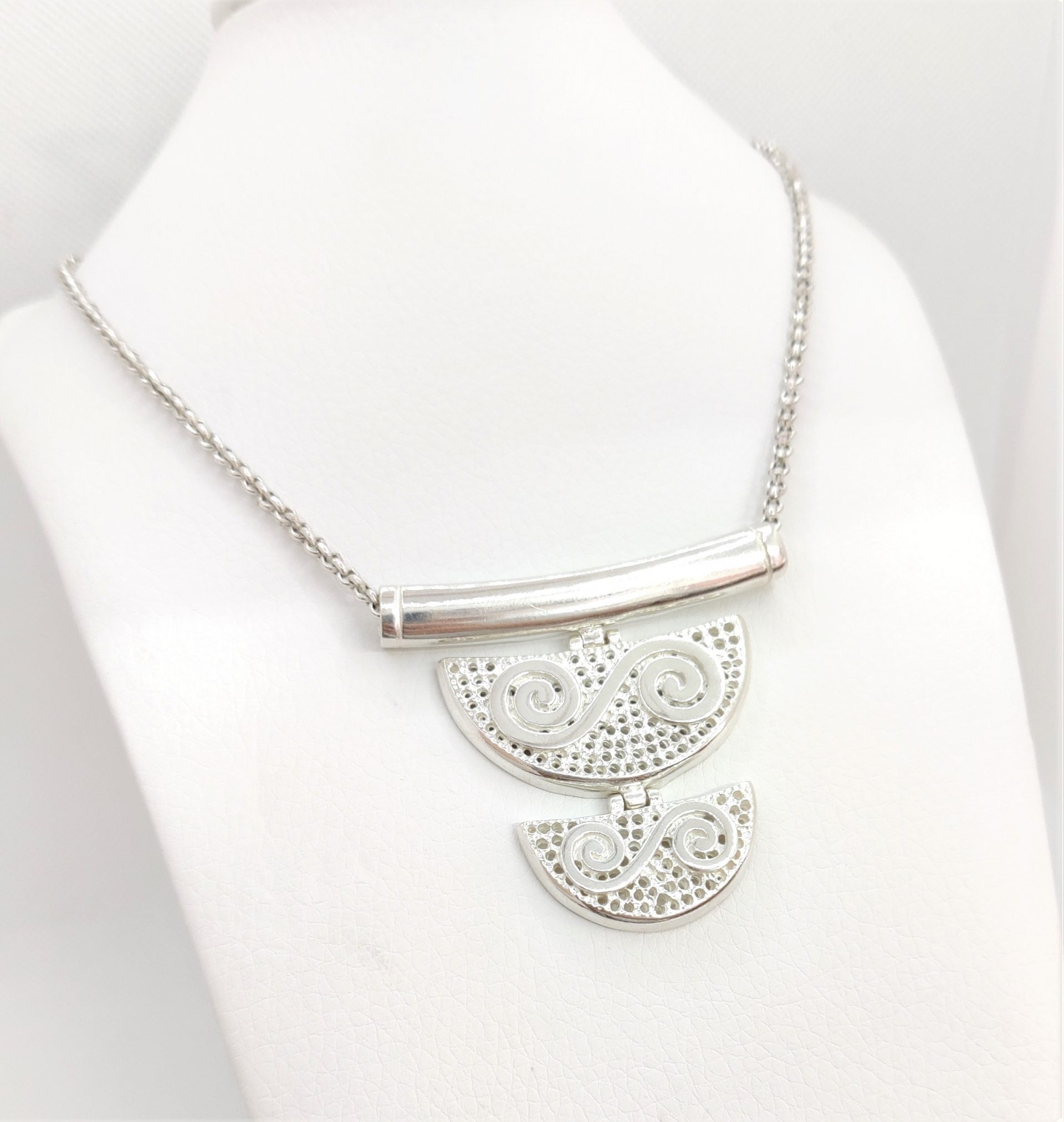 Big amazing pendant with two semi circular parts of perforated surface and double reliefs with spirals, giving the impression of waves