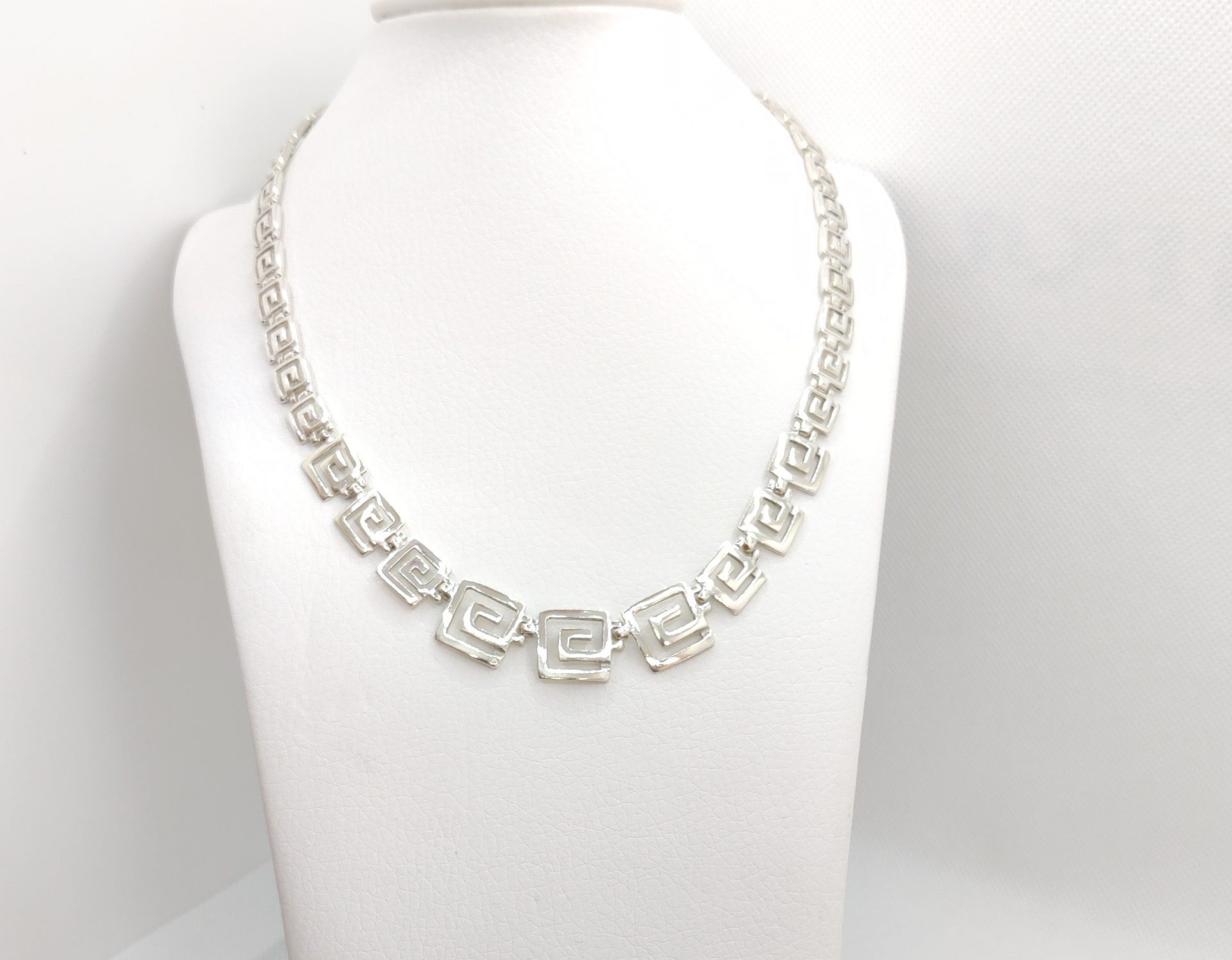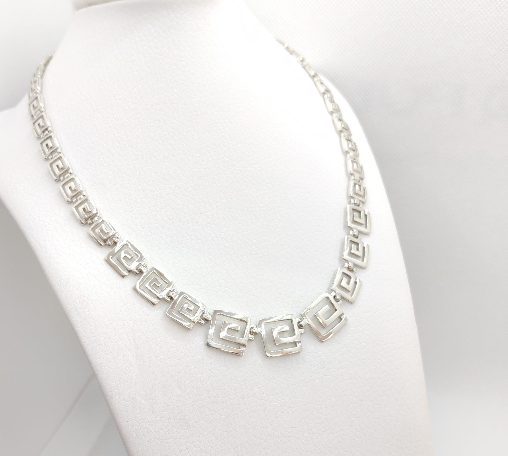 Solid necklace with motifs of square meander of different sizes (0,5cm X 0,5cm, 1cm x 1cm, 1,3cm X 1,3cm). Characteristic design in an interesting schematical approach