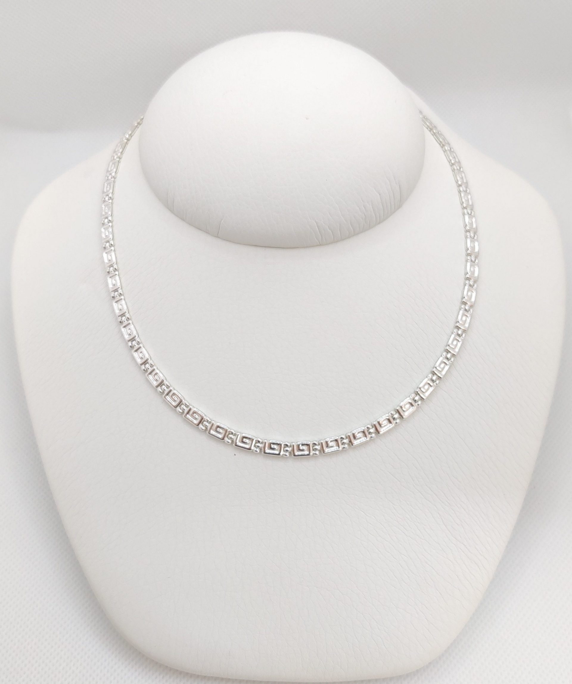 Necklace with discrete motif of Greek key, all along the jewellery, in a modern approach.